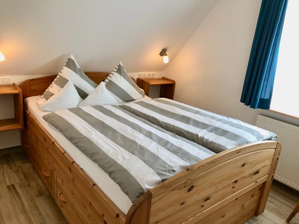 Die 3-Zimmer-Ferienwohnung im Obergeschoss bietet einen Blick über Norddorf und die Dünen. Die maritim eingerichtete Wohnung verfügt über zwei separate Schlafräume. 50qm bieten ausreichend Platz für 2 Personen, die es bevorzugen, etwas großzügiger zu wohnen.